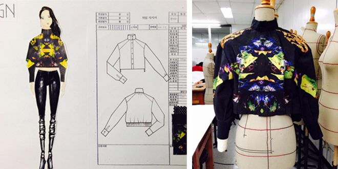 이제서야 내가 제대로 된 공부를 하고 있다는 생각과 내가 만들었다고 말할 수 있는 결과물들이 눈에 보였기 때문입니다. 원단시장을 돌아다니며 마음에 드는 원단을 골라 실물 제작을 해보는 것부터 시작해서 직접 디자인은 물론 디자인의 발상부터 어떻게 표현 할 것인지, 프린팅과 소재개발 등을 연구하고 실루엣을 정하고 패턴을 구성하고 가봉과 수정을 반복하며 완성하기까지 매 분기별로 새로운 것들을 익히며 배우기에 바쁘지만 디자인의 기초부터 다양한 기법들을 배우는 시간들이 참 재미있습니다. 디자인의 기초도 몰랐던 여러분들께서도 이 과정들을 거쳐 무에서 유를 창조하는 과정에 직접 참여를 하게 된다면 정말 벅찬 감동을 느끼실 수 있을 겁니다.