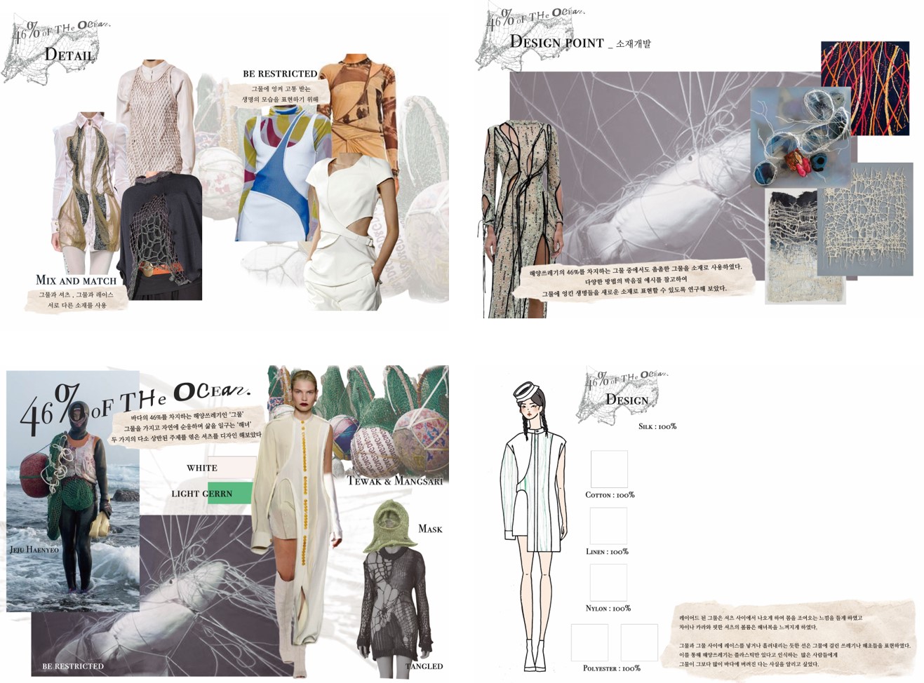 지난 1년의 시간 동안, 가장 공들여 만든 첫 작품인 창작셔츠를 완성했던 순간이 떠오릅니다. 바다의 46%를 차지하는 해양쓰레기인 ‘그물’과 그물을 가지고 자연에 순응하며 삶을 일구는 ‘해녀’ 두 가지의 다소 상반된 주제로 디자인하였습니다. 실제 그물을 이용해서 소재로 개발하는 것은 힘든 일이었습니다. 개발하는 중간 구멍이 뚫리거나 열에 의해 녹거나 줄어드는 등 많은 실패와 수정을 반복했습니다. 셔츠를 마네킹에 입히고 ‘이걸 내가 만들었다고? 하나를 해냈구나!’ 라고 느낀 순간 수많은 실패와 수정을 반복했던 시간들이 아깝지 않았습니다. 더 많이 배운다면 지금보다 더 발전된 작품을 만들어낼 수 있고, 이보다 큰 성취감을 느낄 수 있다고 생각하니 앞으로가 기대됐습니다.
