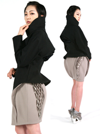 태초의 지구의 모습이 거품과 기포였을 것이라는 상상에서 출발, 거품의 동그란 형태와 방울방울 일어나는 거품의 모습을 재킷과 스커트로 형상화했다. 재킷의 앞, 뒷 요크를 입체감있는 곡선으로 만들고, 어깨에서부터 자연스럽게 떨어지는 기모노 소매를 붙여 전체적으로 둥그스름한 실루엣을 표현했다. 둥근 방울의 형태를 연상시키게 하는 스커트는 솜 패드를 대어 엉덩이 부분을 더욱 강조했다. 재킷부터 스커트까지 이어지는 날개 라인은 입체 재단을 통해 자연스러운 곡선의 형태를 살렸고, 그 위에 소재개발을 통해 거품의 기포를 연상시키는 디테일을 적용했다.