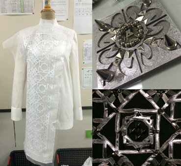 셔츠의 볼륨을 박시한 일자 핏으로 정했기 때문에 소재개발에 더욱 신경을 세웠다. 자칫하면 초라해보일 수 있는 위험한 기본적인 볼륨이었다. 그래서 할 수 있는 소재 개발은 모두 도전해 보려 했다. 이 때 동화상가를 다니며 부자재, 소재 개발에 사용될 수 있는 방법들에 대해 많이 알 수 있게 되었다. 원단 전사 프린트는 기본이었고, 레이저커팅, 본딩, 비딩, 자수, 특수필름 작업 등 시도해 볼 수 있는 것들은 모두 해보았다. 다양한 소재 개발 경험을 통해 같은 주제이지만 어떤 소재 개발을 사용하느냐에 따라 옷이 무궁무진해질 수 있음을 몸소 체험할 수 있어 즐거웠다. 또한 옷의 디자인, 볼륨에 따라 적절하거나 그렇지 않은 소재 개발들이 있다는 점을 깨닫게 되었다.
