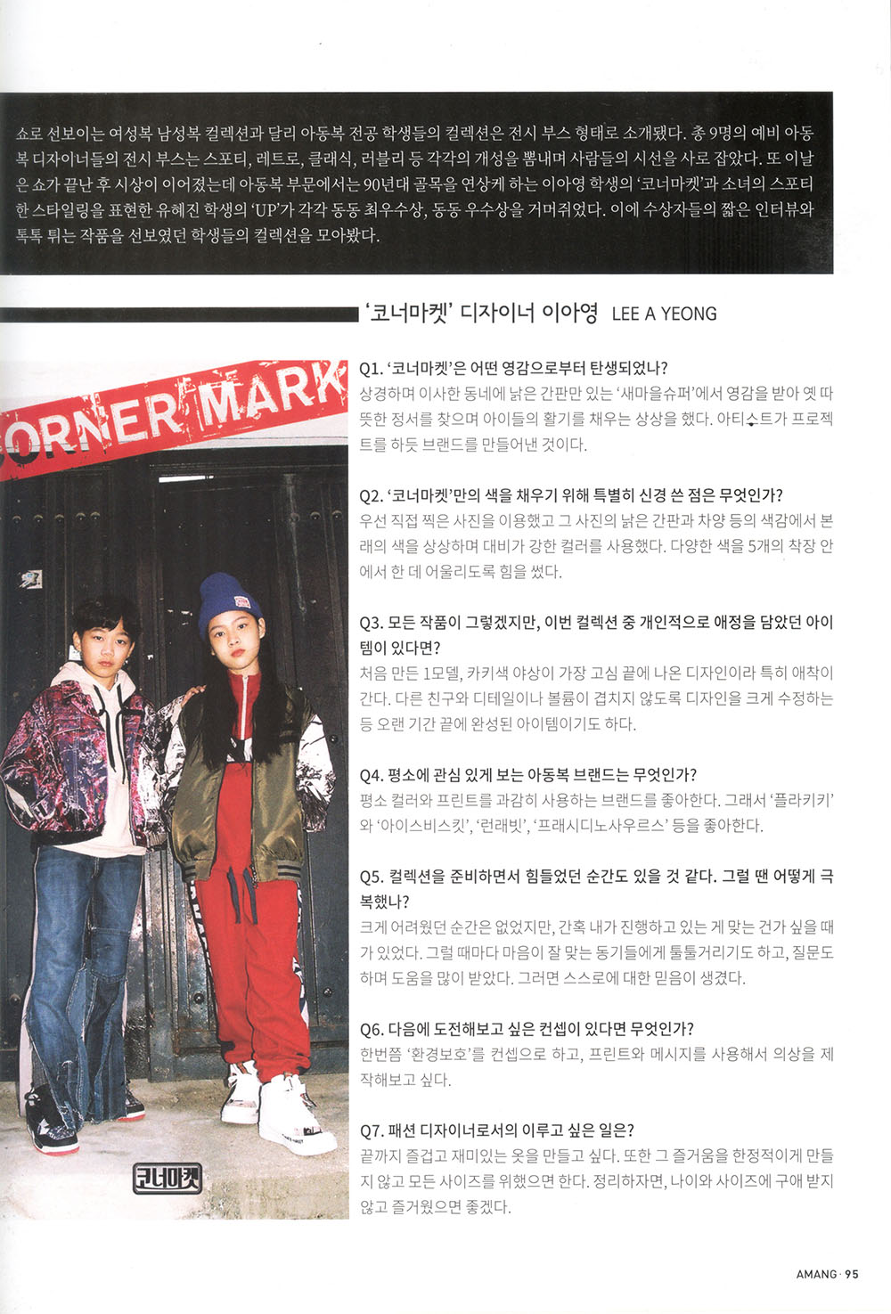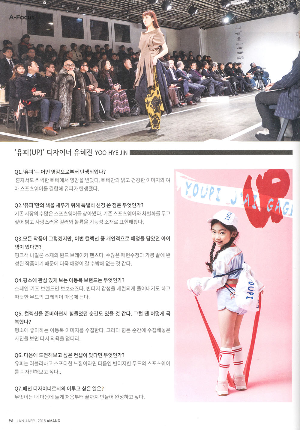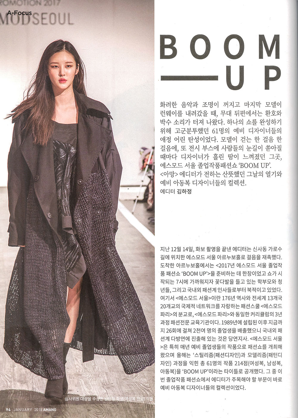 Kids 패션&라이프스타일 전문지 「AMANG」2018년 1월호에 에스모드 서울 제27회 졸업작품발표회 관련 기사가 4페이지에 걸쳐 게재됐습니다. 이와 함께, 동동최우수상과 동동우수상을 수상한 아동복 전공 이아영, 유혜진 동문의 인터뷰 기사도 함께 실렸습니다.