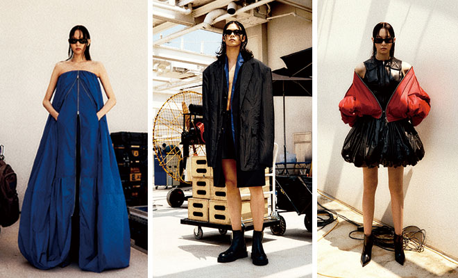 준지는 ‘가벼움과 유스(Youth)’에 포커스를 두고 이번 시즌 컬렉션을 구성했다. 초경량의 합섬 소재를 사용해 가벼움을 표현하는 한편 바람으로 만들어지는 우아한 볼륨과 풍성한 실루엣을 아우터, 셔츠, 맥시드레스 등에 세련되게 디자인했다. 또 어깨가 강조되고 허리가 단단하게 조여진 테일러드 재킷에 바람에 흩날리는 가벼운 합섬 볼륨 스커트를 매칭해 소재의 콘트라스트 효과를 높였다.