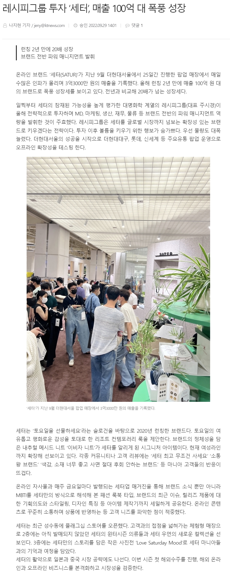• 내용: '토요일을 선물하세요'라는 슬로건으로 2020년 등장한 브랜드 SATUR(세터). 세터는 남성복을 전공한 손호철 동문(25기)이 론칭한 브랜드 로, 2022년 9월 더현대서울에서 진행한 팝업 매장에서 매일 수많은 인파가 몰리며 3억3000만 원의 매출을 기록했다.