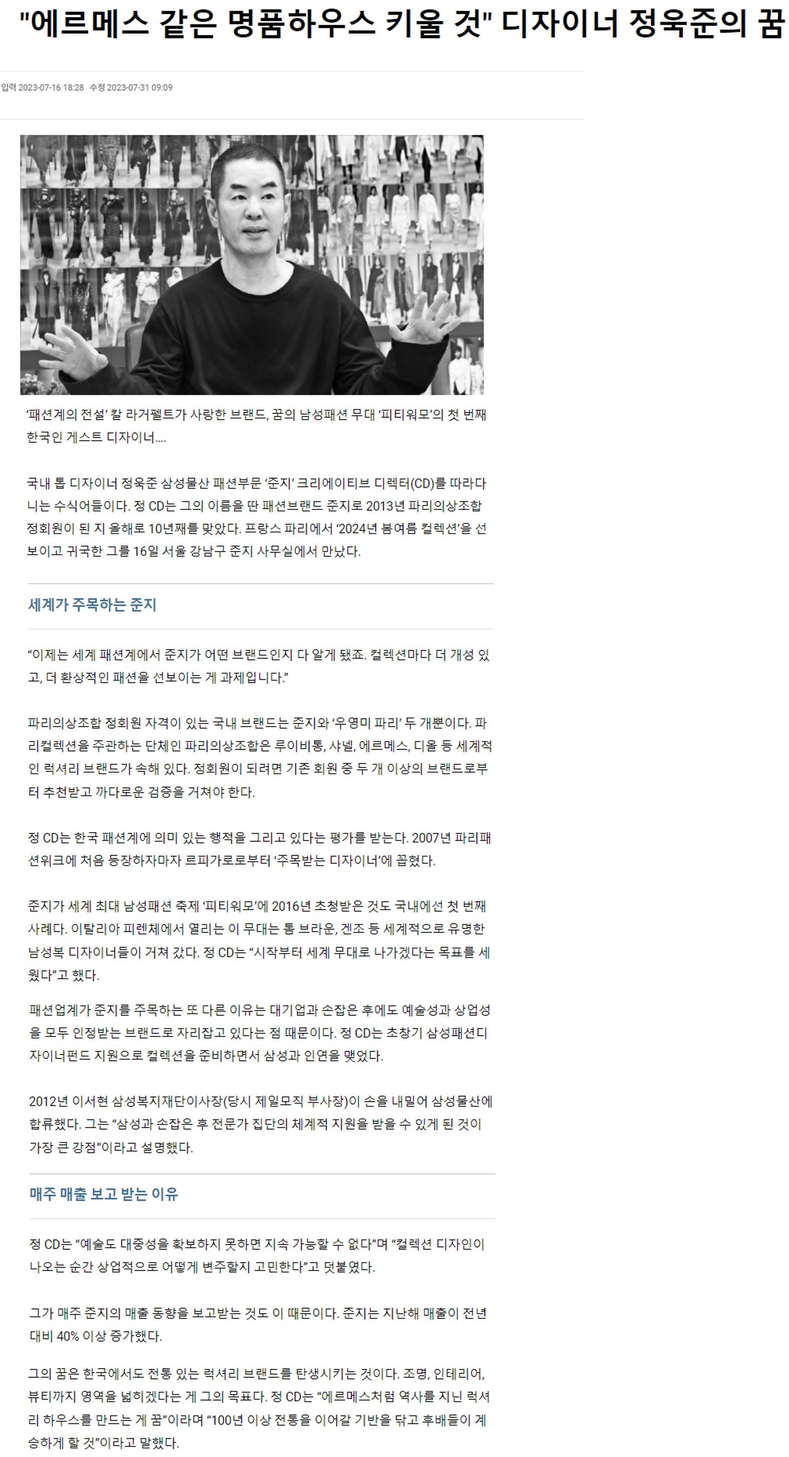 • 내용: 2007년 파리패션위크에 처음 등장하자마자 '르피가로' 로부터 '주목받는 디자이너'에 꼽힌 준지. 파리의상조합 정회원이 된지 올해로 10년을 맞은, 에스모드 서울 2기 정욱준 동문 준지의 인터뷰 기사