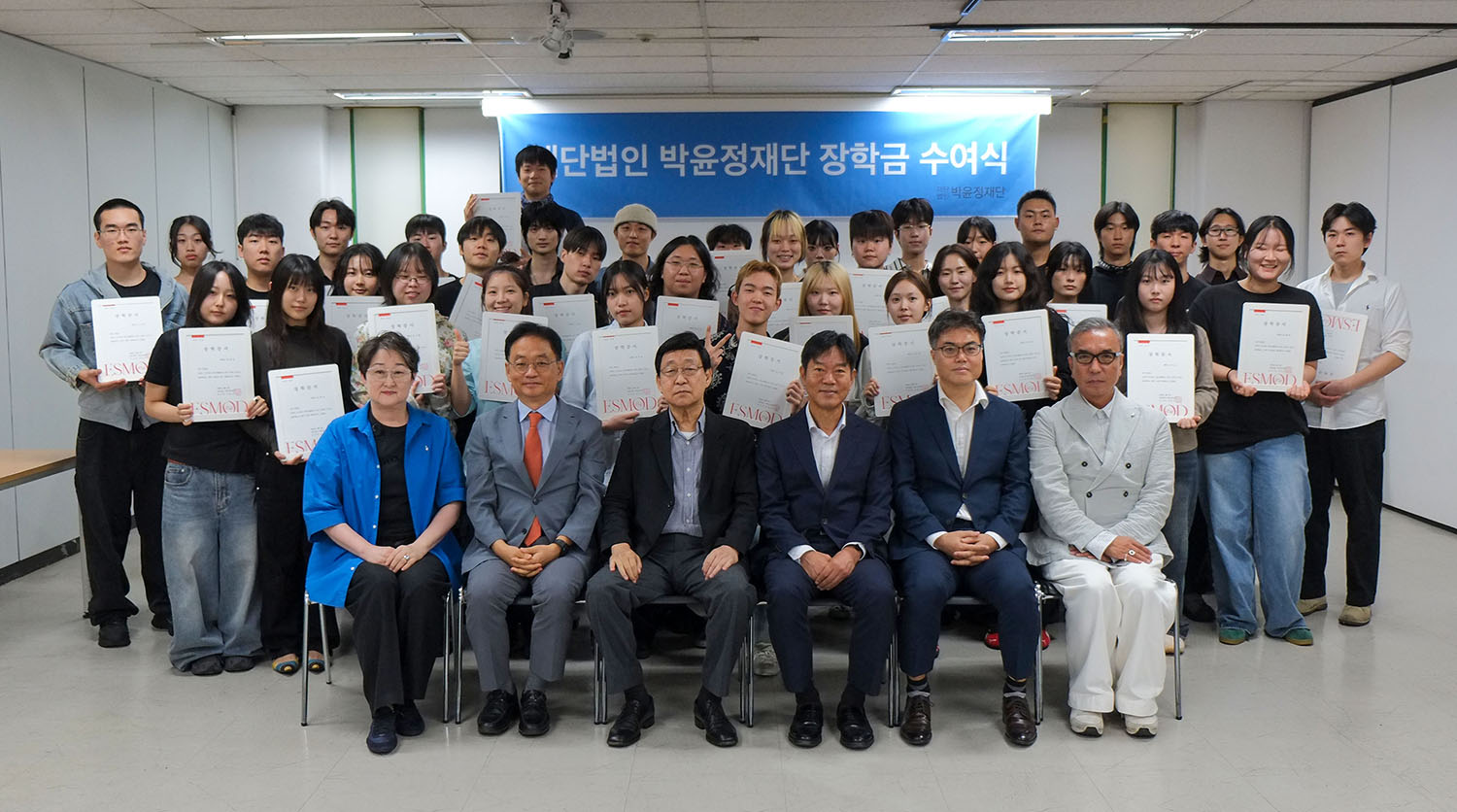 9월 3일, 2025학년도 2학기 에스모드 서울 장학증서 수여식이 열렸다. 수여식에는 에스모드 서울 고은경 대표, 홍인수 교장, 박윤정 재단 김동건 이사장, 송원문화재단 서정민 사무국장, 박윤정 재단 이영열 이사, (주)픽스쳐패브리케이션 안용상 이사, 그리고 에스모드 서울 교직원과 이번 학기 장학생들이 참석했다.