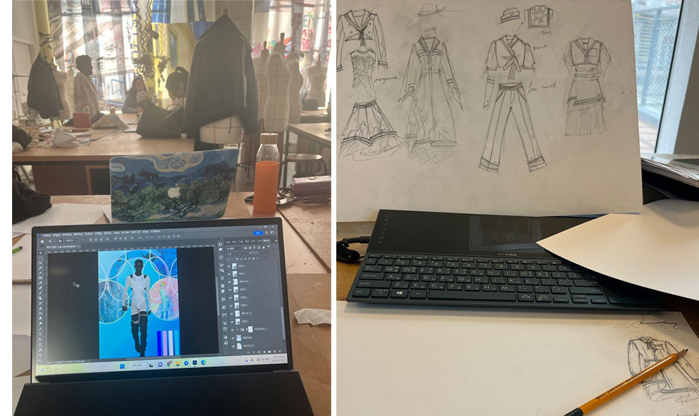 무드보드 제작수업에서는 각자 생각나는 것들을 서로 이야기한 후 그 중 가장 마음에 드는 것을 뽑아 무드보드를 만들기 시작했다. 서울에서 수업 시, 무드보드의 주제를 정할 때는 일주일이 넘는 시간을 투자해 정성껏 주제를 정했는데, 한순간에 주제를 정하고 빠르게 시작하는 것이 어색하기도 했지만 흥미로웠다. 함께 교환학생 프로그램에 참여한 동료와 한 팀을 이뤄 아바타의 영화로부터 영감을 시작해서, 뫼비우스와 바다를 생각하며 바다 속에서 입을 수 있는 슈트를 무드보드 주제로 정했다. 그러고 나니 디자인도, 도식화를 그리는 것도, 패턴을 뜨는 것도 금방이었고 일주일이 지나고 보니 그럴 듯한 옷이 완성돼 있었다.
