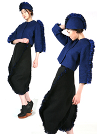 태초의 지구의 모습이 거품과 기포였을 것이라는 상상에서 출발, 거품의 동그란 형태와 방울방울 일어나는 거품의 모습을 재킷과 스커트로 형상화했다. 재킷의 앞, 뒷 요크를 입체감있는 곡선으로 만들고, 어깨에서부터 자연스럽게 떨어지는 기모노 소매를 붙여 전체적으로 둥그스름한 실루엣을 표현했다. 둥근 방울의 형태를 연상시키게 하는 스커트는 솜 패드를 대어 엉덩이 부분을 더욱 강조했다. 재킷부터 스커트까지 이어지는 날개 라인은 입체 재단을 통해 자연스러운 곡선의 형태를 살렸고, 그 위에 소재개발을 통해 거품의 기포를 연상시키는 디테일을 적용했다.