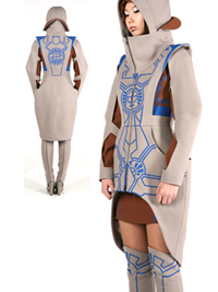 우주와 지구와의 소통을 주제로 잡고 지구에서 본 우주의 기하학적 선형과 지구에 그려진 미스터리 서클을 디자인으로 활용했다. 미스터리 서클에서 보여지는 형이상학적 무늬를 바디 라인에 접목해 새로운 도안을 개발했다. 단순한 프린트가 아닌, 아웃도어에 주로 쓰는 웰딩 테이프를 사용해 기하학적 형태가 더욱 돋보이게 하였다. 우주 공간에서 보이는 직선과 곡선의 무한함을 정형화 되어있는 우주복에 가미해 새로운 실루엣을 찾았다. 후드는 여러 형태로 변형되고 소매와 부츠 워머는 탈부착이 가능해 착용자의 필요에 따라 자유롭게 연출할 수 있다. 미래 도시적인 분위기를 풍기는 웜 그레이와 지구의 대지를 상징하는 브라운 컬러를 사용해 우주와 지구의 소통을 보여주려 했고, 블루를 포인트 컬러로 사용해 사이버틱하면서 그래픽적인 요소를 가미하였다.
