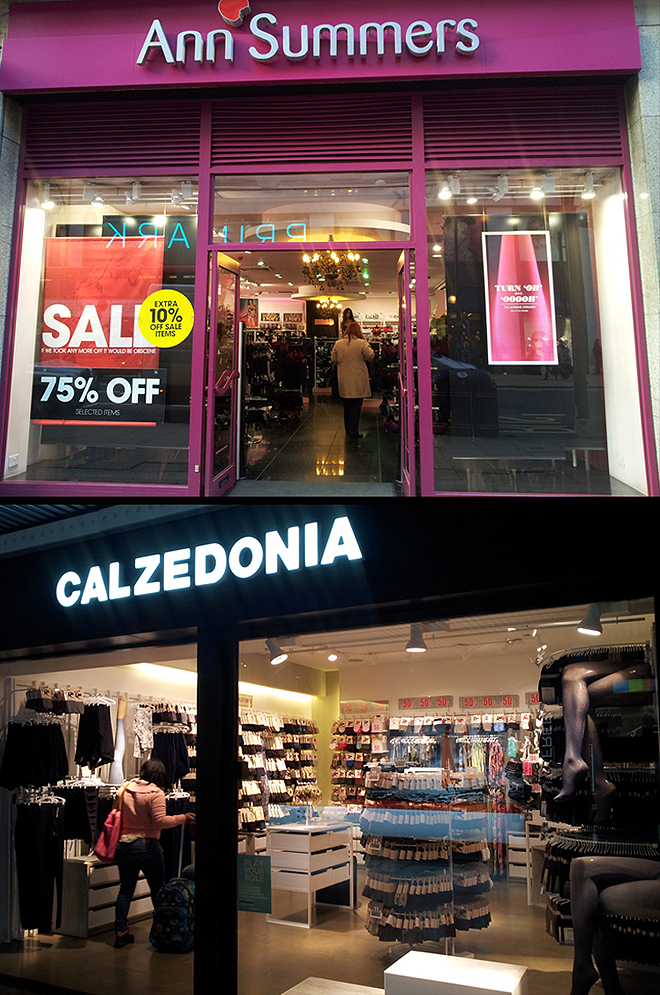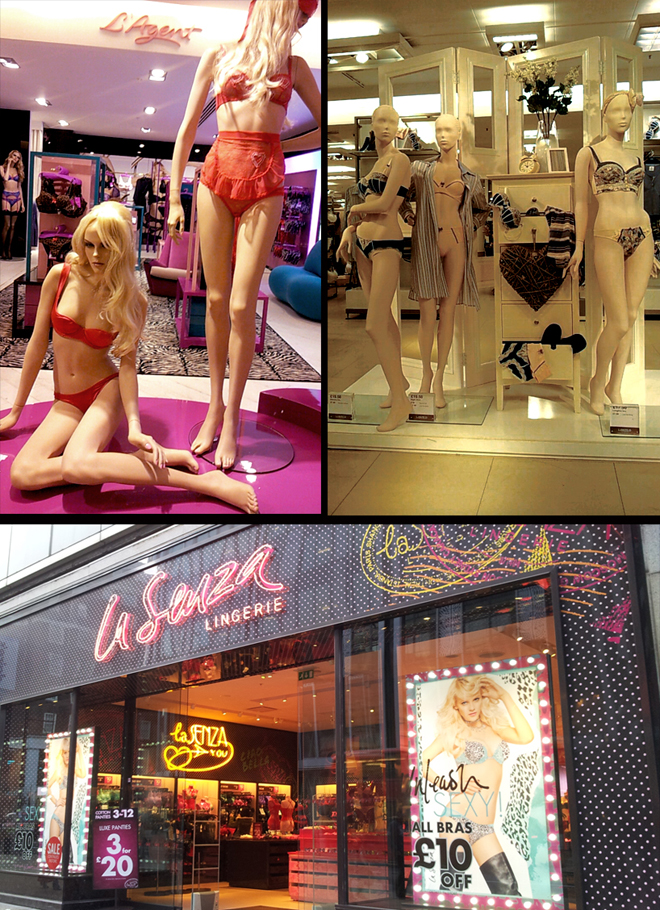 런던의 중심 상점가인 Oxford Street 시장조사를 했는데, 다른 나라에 비해 속옷이 매우 과감했다. 그밖에 M&S, Harrot, Selfridges 등 런던의 주요 백화점들을 돌아다니면서 란제리 시장 조사를 했다. La Senza와 Tezenis가 Oxford Street에 로드샵으로 제일 많이 눈에 띄었다. 둘 다 레이스를 많이 쓰고 애니멀 프린트와 과감한 색상의 레이스를 믹스한, 섹시한 라인의 란제리 브랜드였다. 브랜드 컨셉에 맞게 과감한 디스플레이를 해 놓아 다른 매장에 비해 과감하다는 느낌을 받았던 것 같다.
