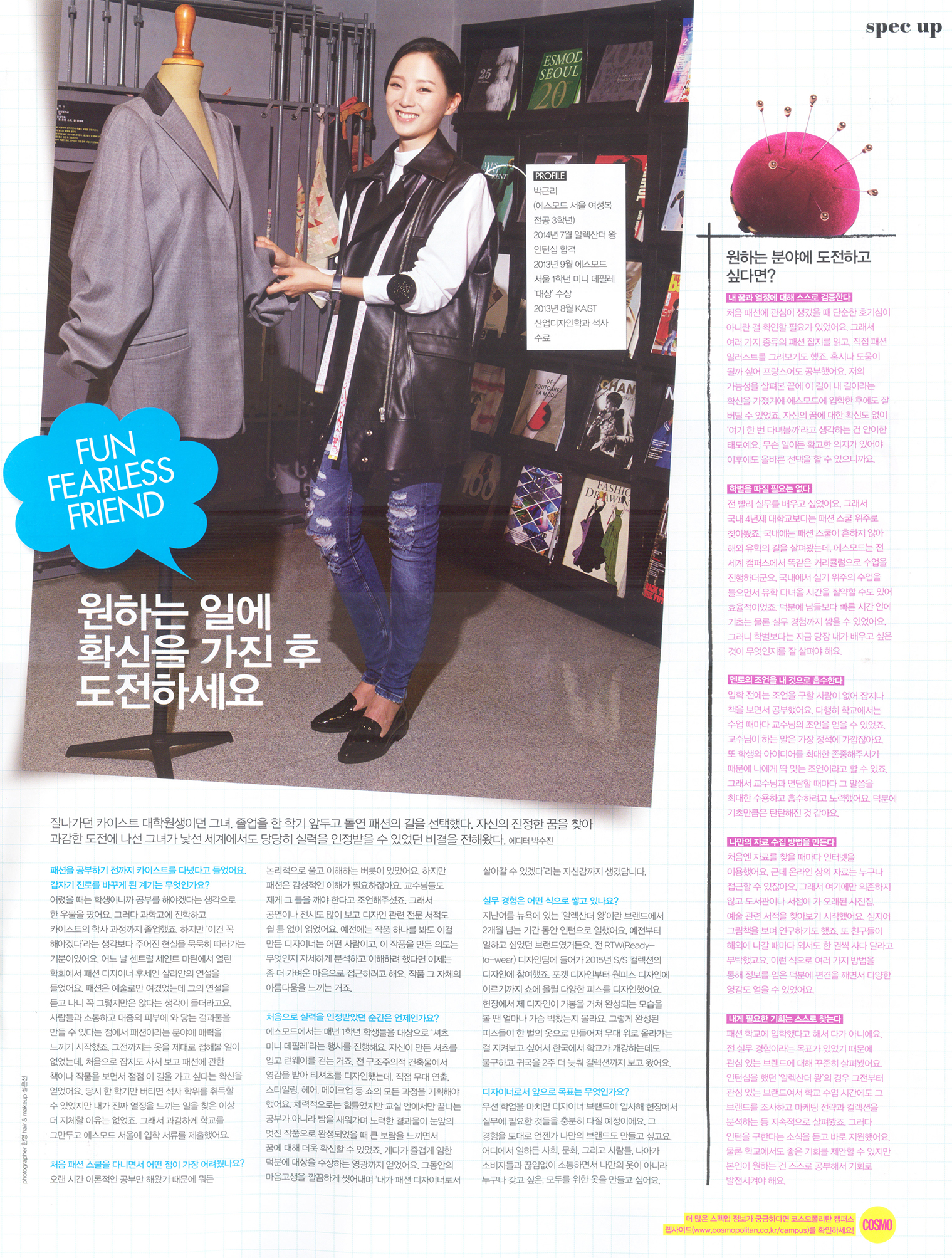 2015년 10월호, 월간지 COSMOPOLITAN에서 캠퍼스 소식만을 전하는 「COSMOPOLITAN CAMPUS」에 에스모드 서울 3학년에 재학중인 박근리 학생의 인터뷰 기사가 실렸습니다.
