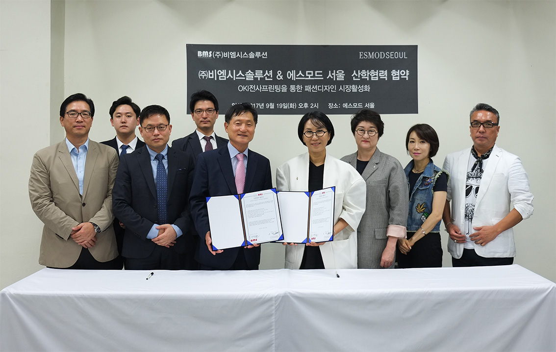 9월 19일, 에스모드 서울이 ㈜비엠시스솔루션(대표: 김시천)과 ‘오키(OKI) 전사프린팅을 통한 패션디자인 시장활성화 산학협력’ 협약을 체결했다.
