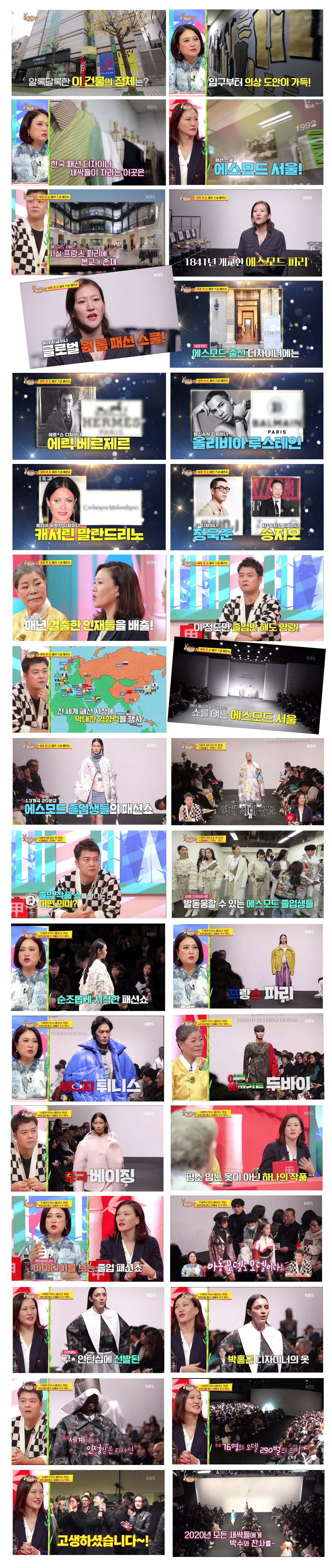 • 내용: 에스모드 서울 개교30주년을 기념한 'ESMOD INTERNATIONAL SHOW & 2019 에스모드 서울 졸업작품쇼'가 방영됐습니다. 재치있는 입담을 지닌 MC들의 소개로, 패션스쿨 에스모드와 우수작품들이 더욱 빛났던 방송의 주요이미지를 공개합니다.