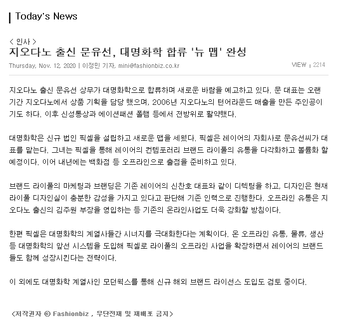 • 내용: 에스모드서울 5기 문유선 동문이, 지오다노에서 상무로 활약하다 대명화학으로 합류한다는 소식이다.