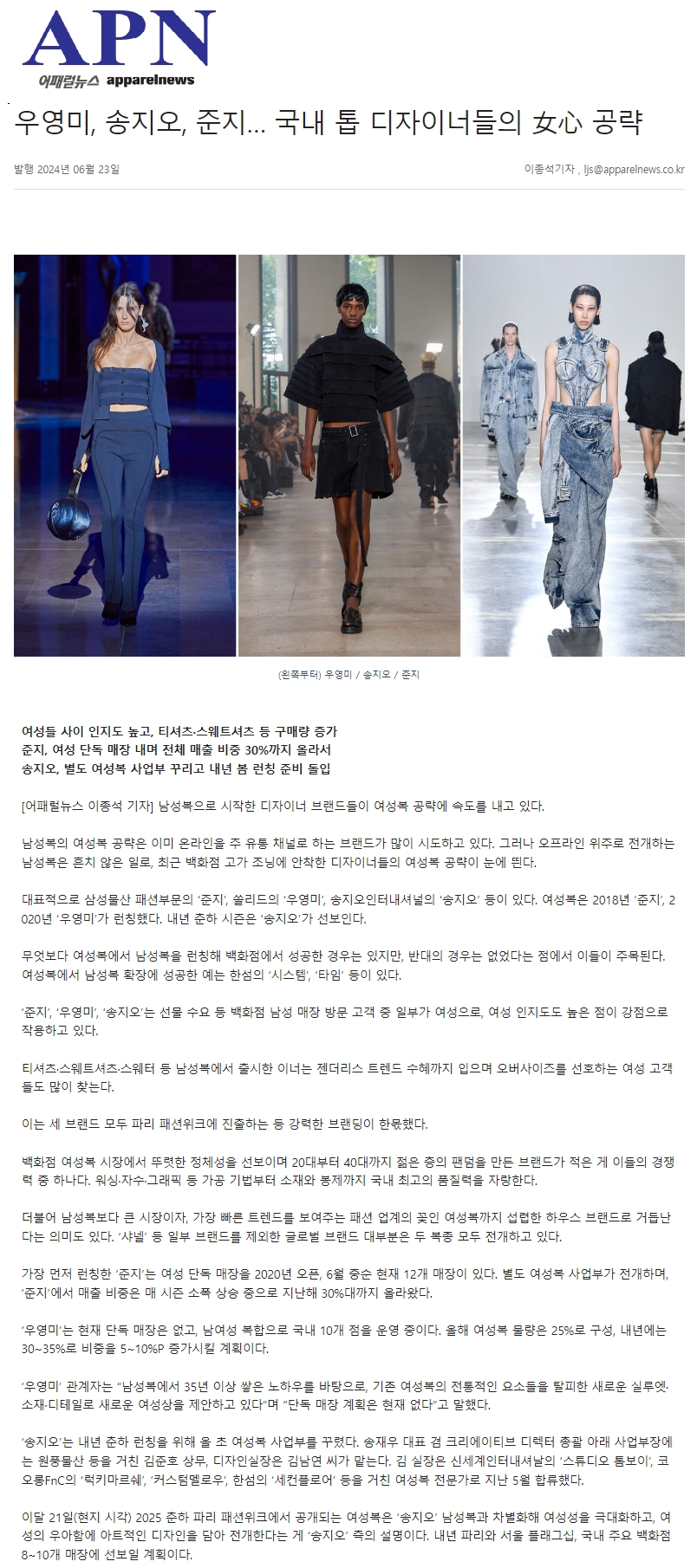 • 내용: 세계적으로 그 인지도를 인정받고 있는 브랜드 송지오(송지오 동문, 에스모드 파리 졸업) , 준지(2기 정욱준 동문, 에스모드 서울 졸업 2기)는 에스모드 출신으로, 최근 파리 패션쇼를 통해 25SS 컬렉션을 발표했다. 남성복으로 시작했지만 여성복으로 점점 더 그 행보를 넓혀가는 이들 브랜드의 현황을 알아본다.